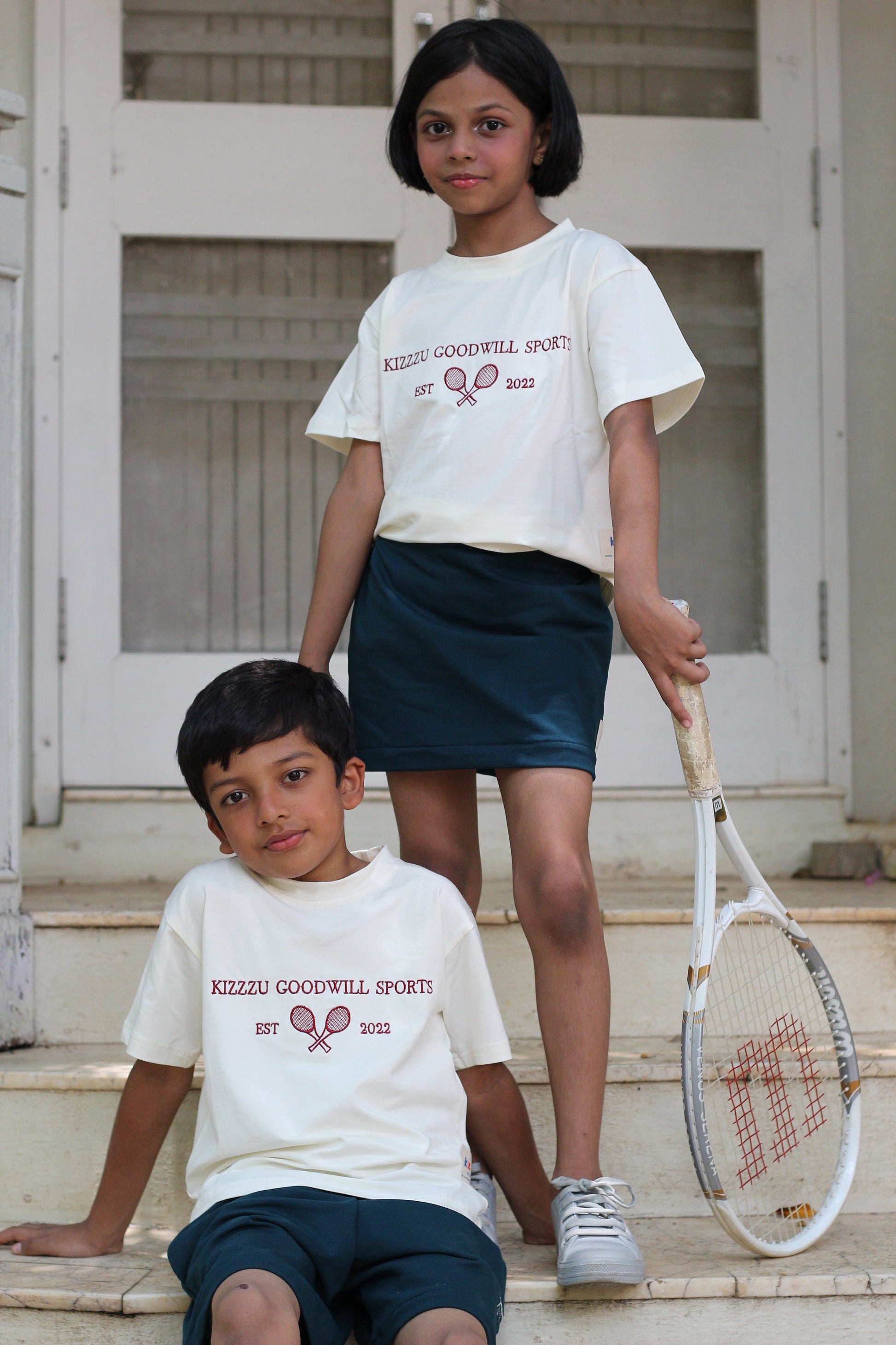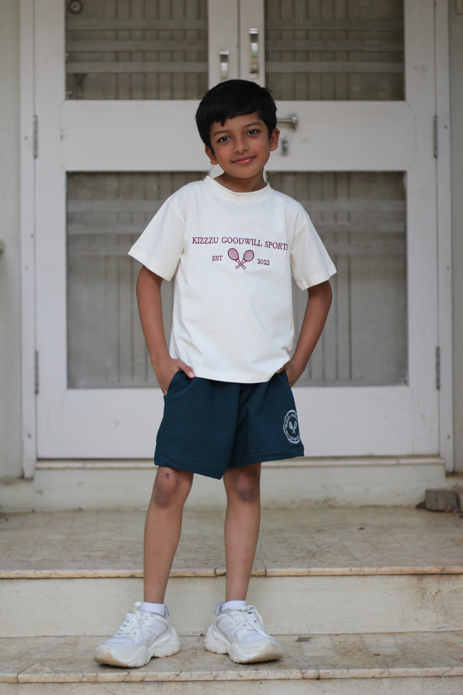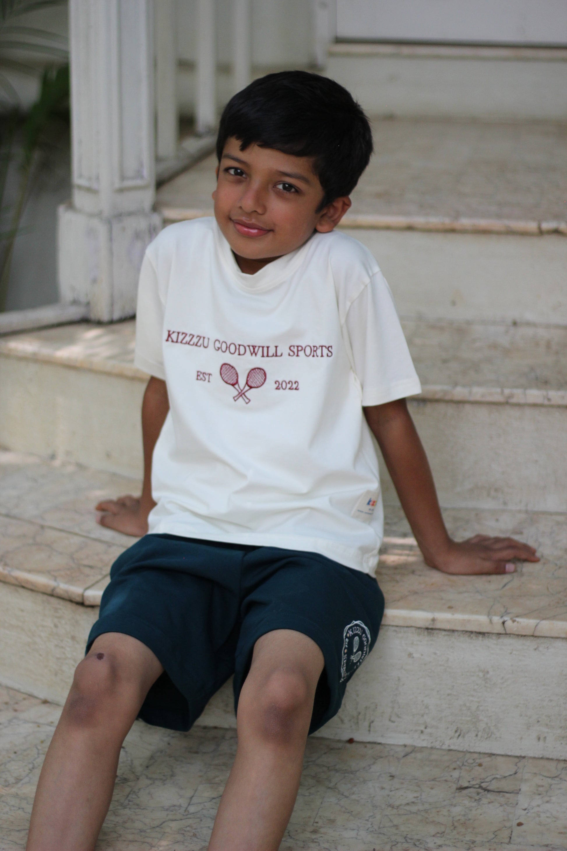 Introducing Kizzu's country club classic - the off-white KIZZU Goodwill Sports T-shirt with a touch of sophistication! This T-shirt features an intricately embroidered club logo, complete with the words "Kizzu Good Will Sports" and lawn tennis rackets, all in a beautiful maroon thread. Made from premium-quality materials, this T-shirt is comfortable, durable, and perfect for any occasion. Whether your child is playing sports or attending a social gathering, this T-shirt is sure to make them stand out in the crowd. Give your child the gift of style and elegance with this timeless T-shirt today, and let them make a statement that captures the essence of the country club lifestyle!