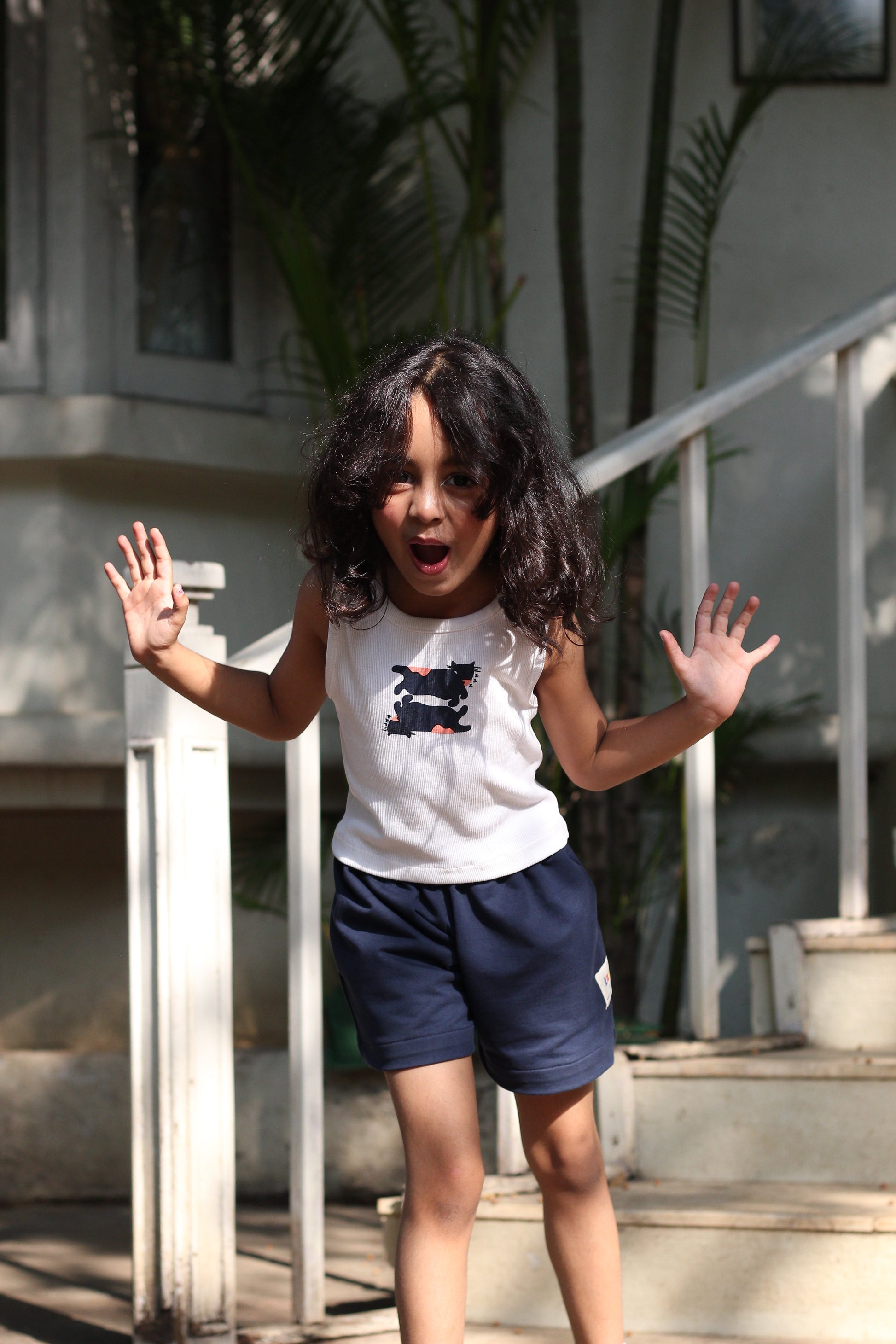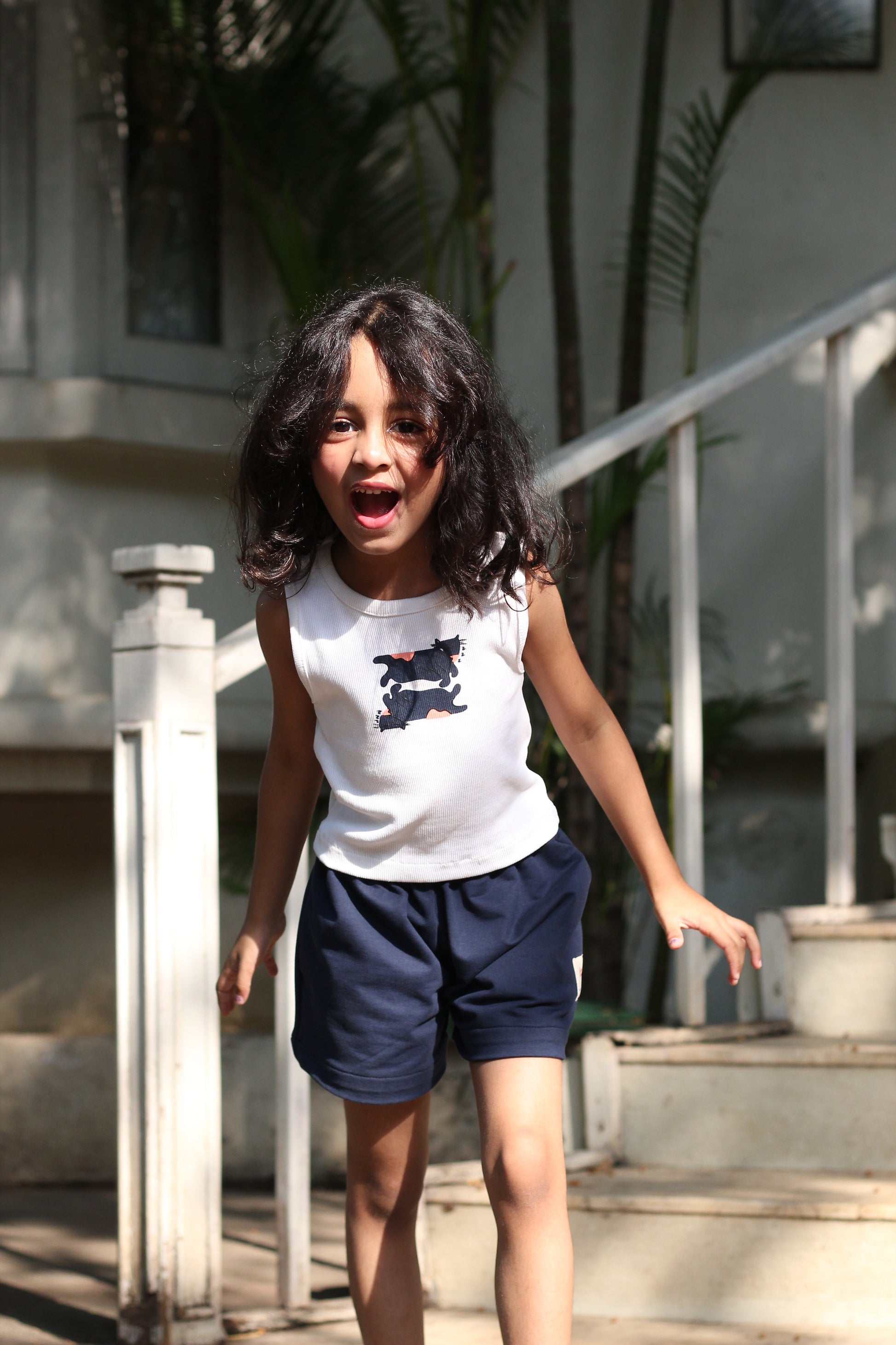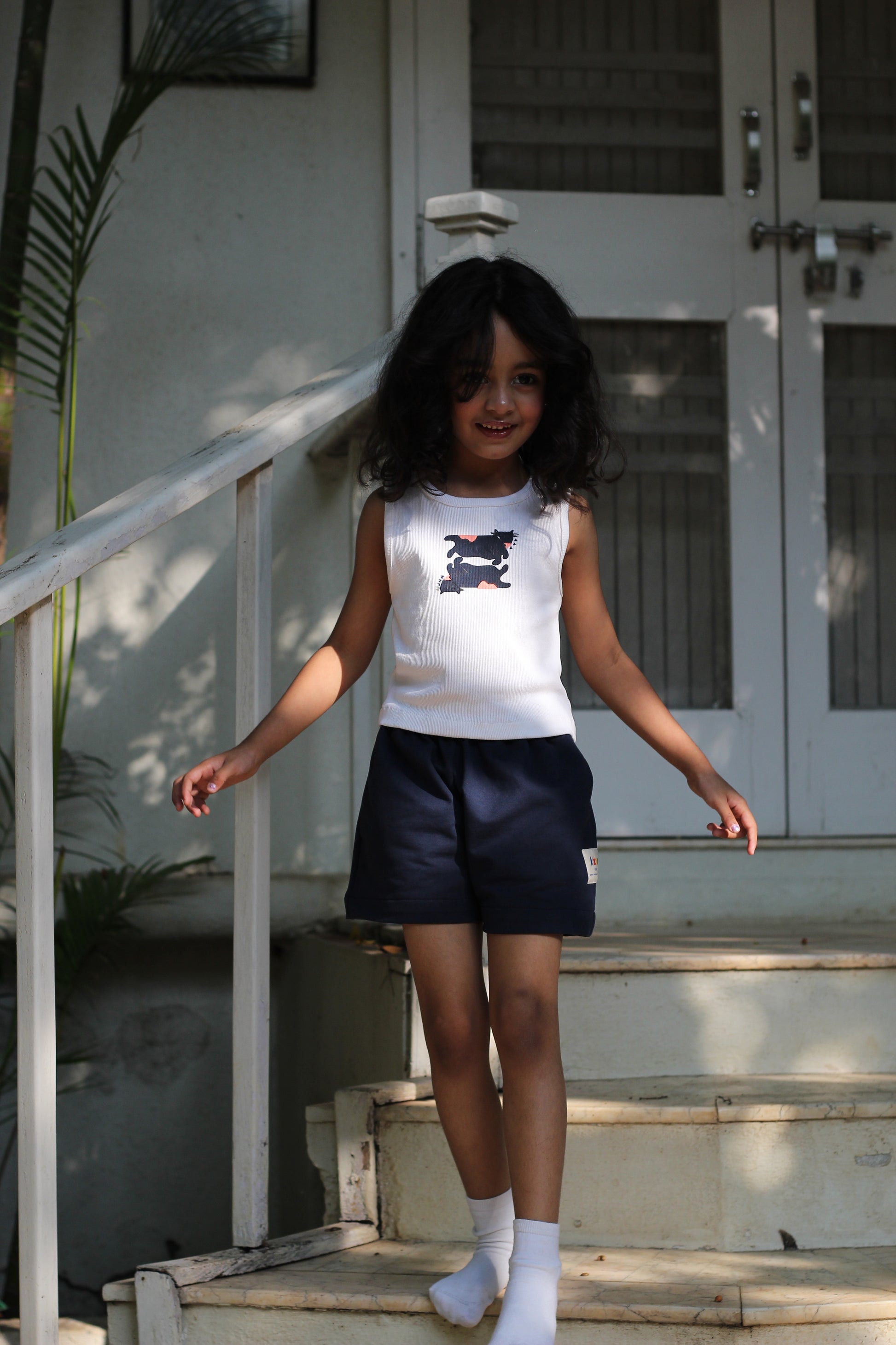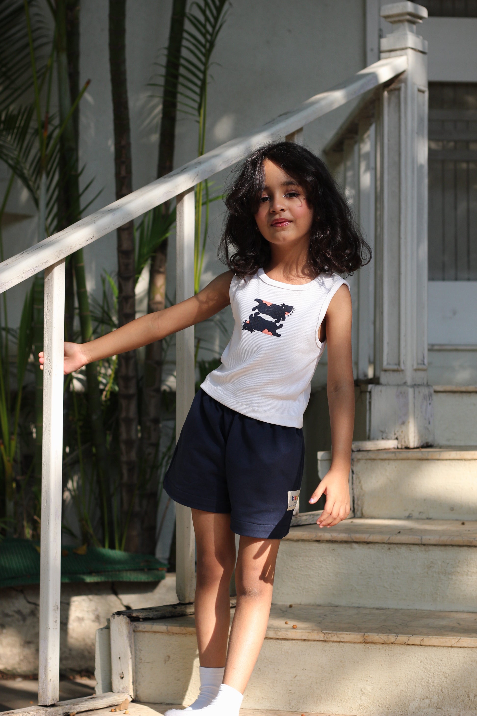 White Meow Co-ord - This set features a white tank top with a cute design, paired with stylish blue shorts that exude elegance. Made from high-quality materials, this set is both comfortable and classy, perfect for any summer day .
